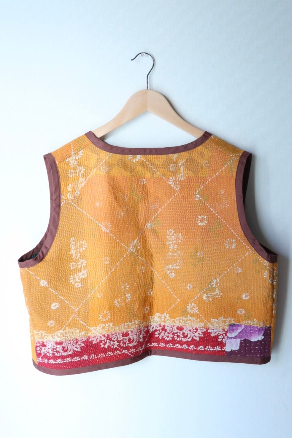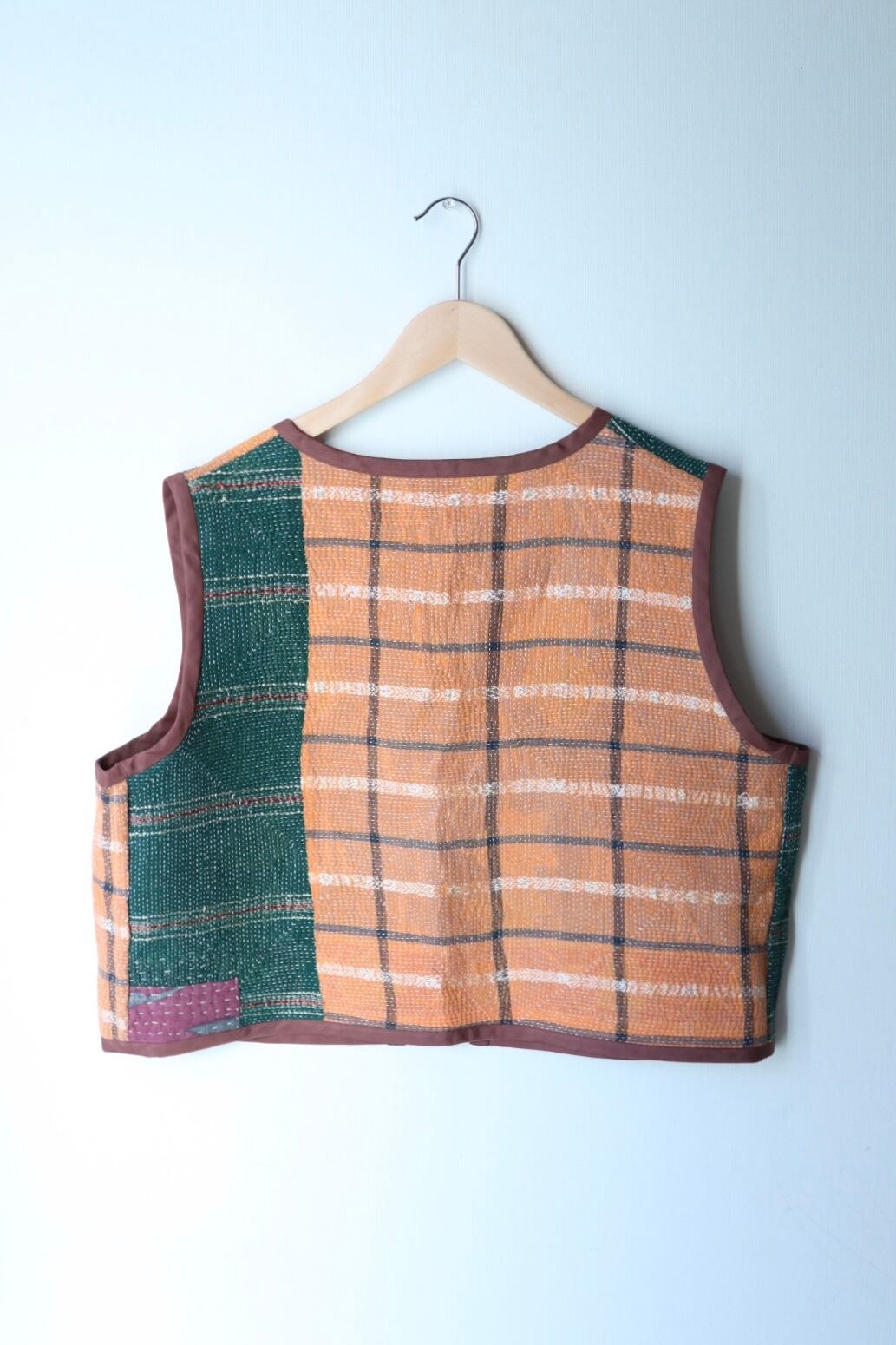 グリーン×オレンジと黄色に背面の裾の赤がポイントのリバーシブルベスト。